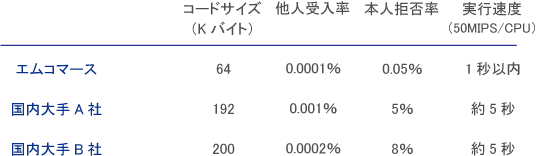 エムコマースでは、米国ベル研究所で開発された基礎技術を基に研究を推し進め、携帯機器に搭載される50MIPS程度のCPUでも 1秒以内で認証可能な最小、最速、高精度の認証アルゴリズムを開発致しました。